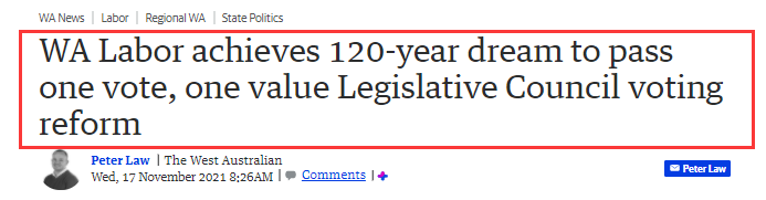 在之前的制度下,尽管珀斯选民占西澳州选民的75%,但他们只选出了上院议员的一半。最引人注目的例子是,居住在矿业和牧区的4%的选民能够选举出近17%的上院议员,这意味着他们的选票份额和价值要高出6倍。而如今的这项改革成就了工党120年来的夙愿,终结了选票分配不均的局面。